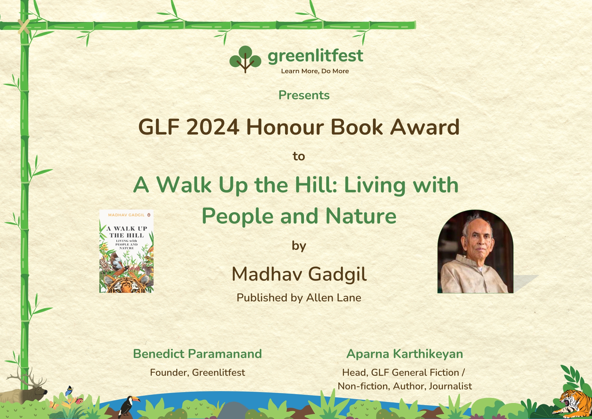 The Green Literature Festival had the honour of awarding his book A Walk Up The Hill: Living with People and Nature the GLF Honour Book of the Year 2024.
