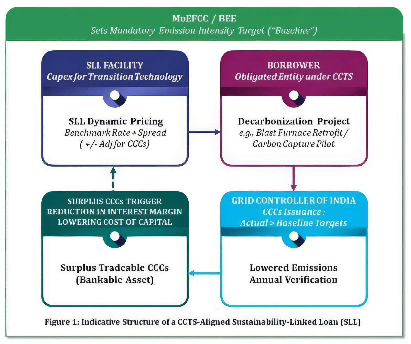Bridging the gap between a company’s current baseline and its mandatory target, the CCTS-aligned SLLs is expected to emerge as a new financing avenue. In this symbiotic structure of SLLs, lenders finance the capex to install necessary technology / systems / infrastructure; the CCTS framework ensures operational rigour and the SLL mechanism provides the pricing incentive to accelerate brown transition. Structurally, it moves beyond standard financing to create a closed-loop system where regulatory compliance directly impacts the cost of capital.