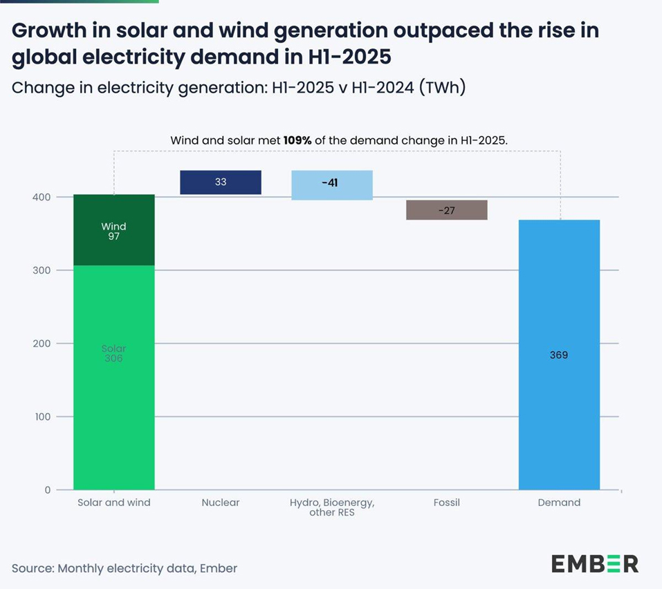 The thinktank Ember reported that for the first half of 2025 solar and wind grew so fast that they covered all the growth in demand for electricity so far this year, with room to spare. Analysts are calling this an epochal moment. It demonstrates that the clean energy transition is real, something that sounded mambo jumbo even three years ago.