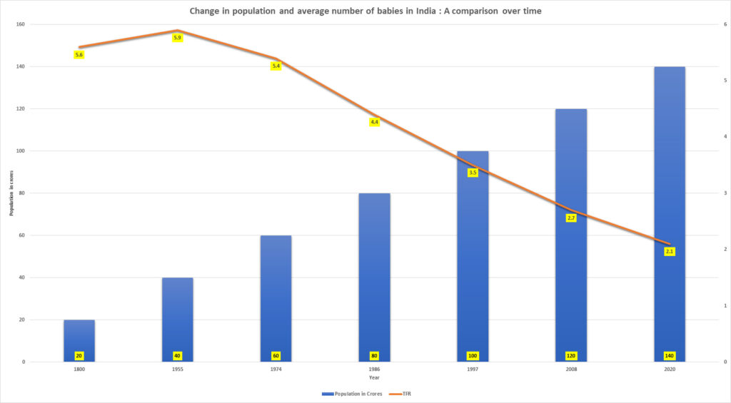 The total fertility rate (TFR) has dropped from 6 children per woman when India’s population was 500 million to around 2 at 1.4 billion in 2021. This decline aligns with improvements in child survival (from 28% to 3% mortality), women’s education (from 0.4 to 5.6 years), and poverty reduction (from 63% to 10% living in extreme poverty between 1977 and 2020). This is a remarkable achievement for a hugely populated, newly formed democracy that was marred with massive developmental challenges at the time of independence, only 75 years ago.