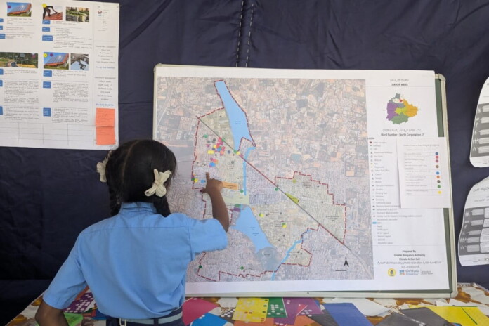 A student identifies her neighbourhood in Jakkur at the public consultations for the Ward-level Climate Action Plan in Bengaluru. Image by Mahima Jain